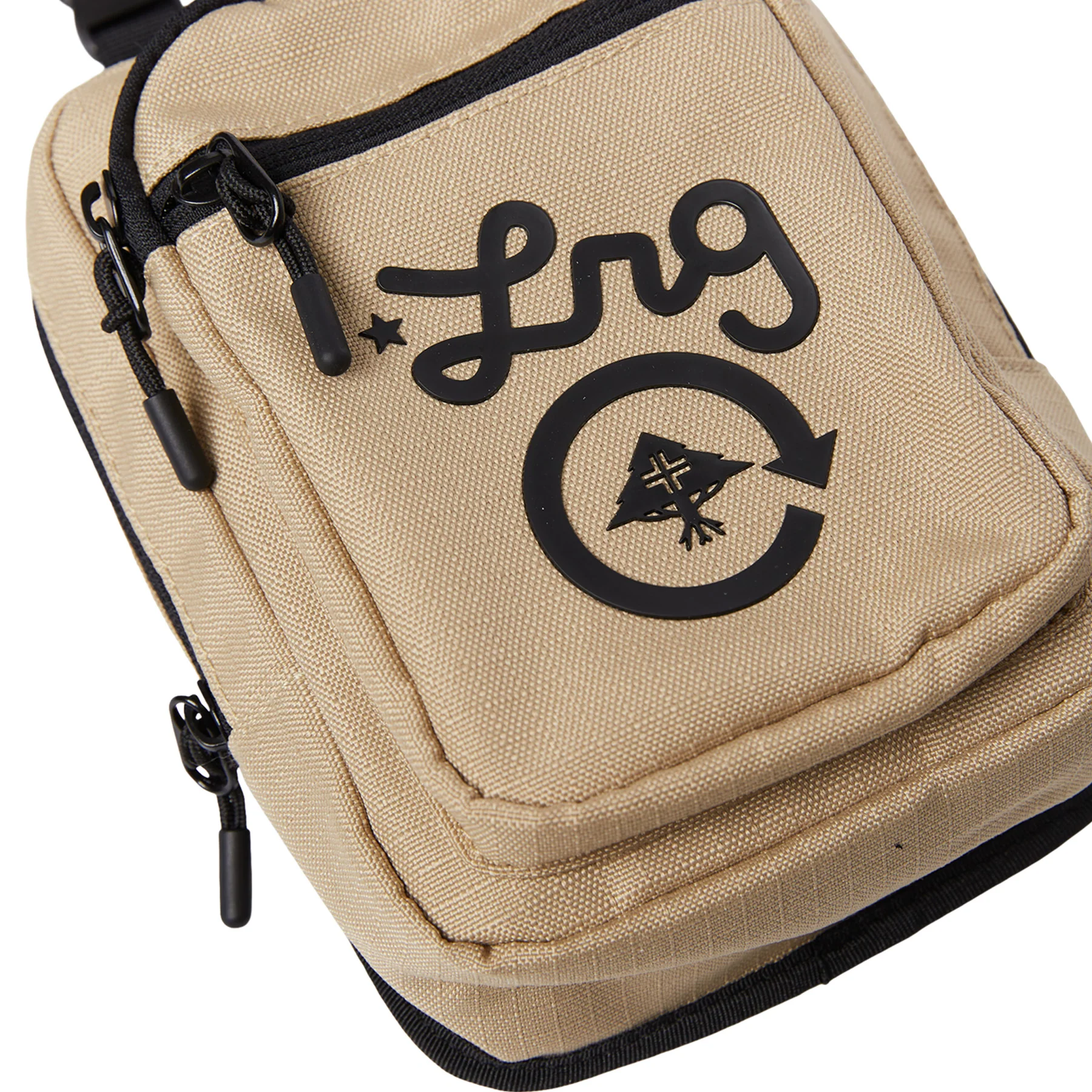 The Remix Utility Crossbody in sand features the classic LRG cycle logo with two zipper pockets on the front.