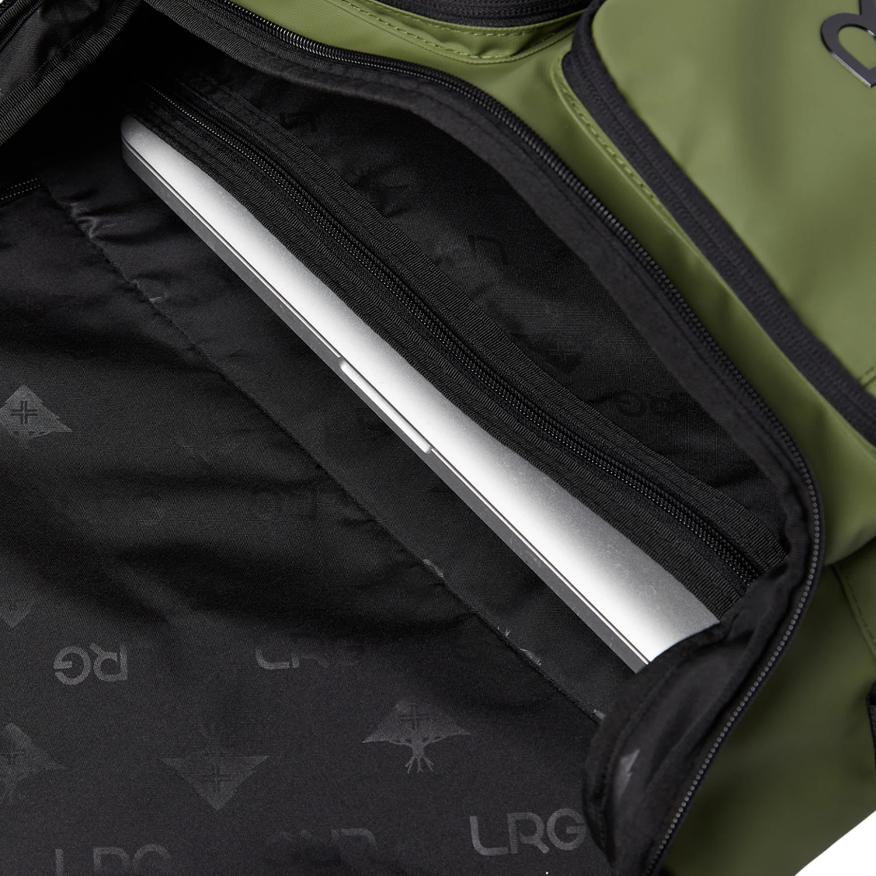 The Showcase Utility Messenger in black features the LRG stacked logo and a long strap with a large center opening.
